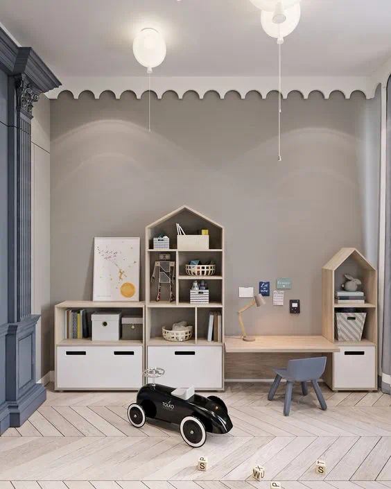温馨儿童房,则可以打造成孩子的游乐天地。小朋友可以在这里看看喜欢的漫画书,摆弄最爱的乐高和玩具熊。