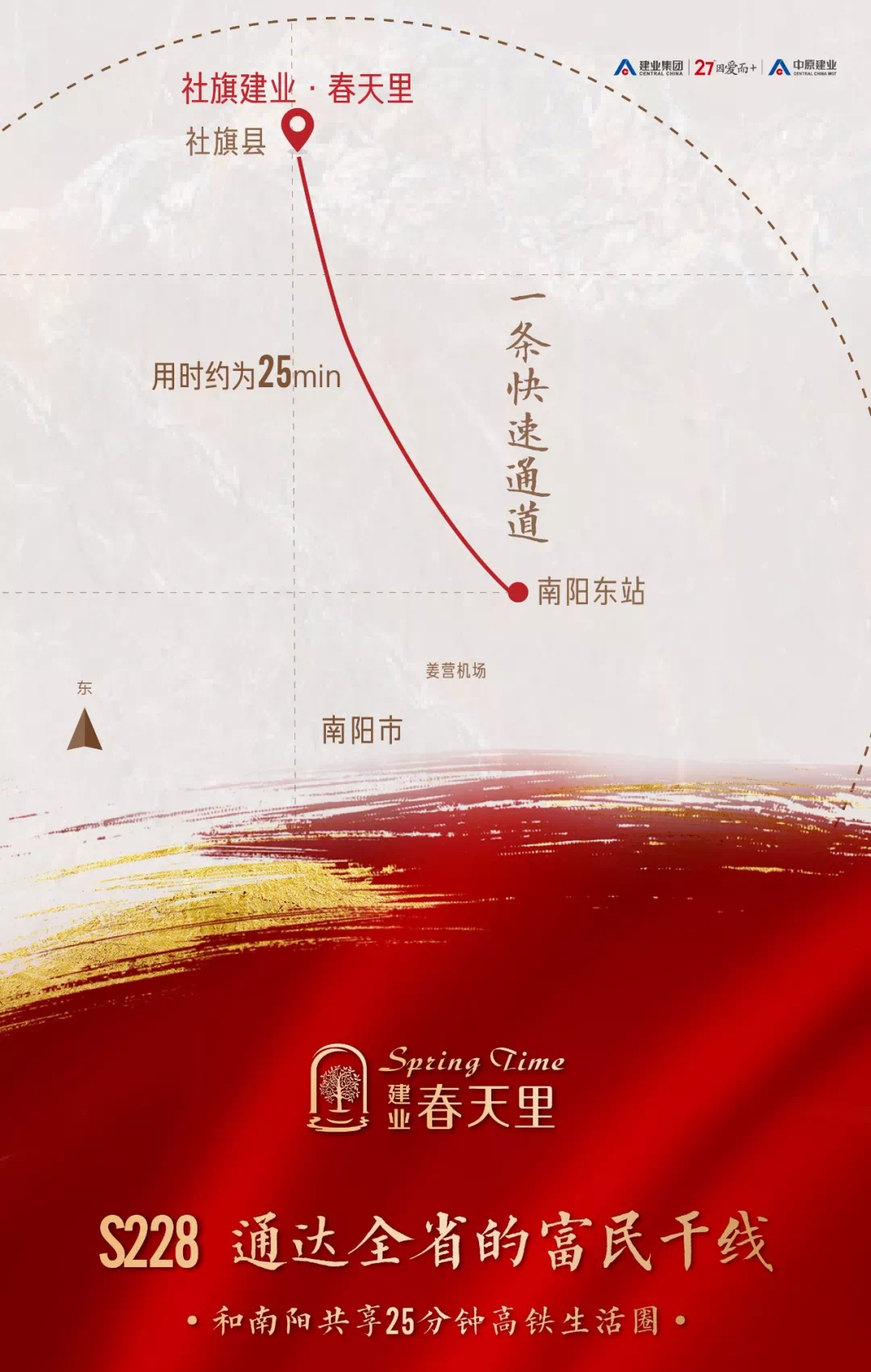 建业春天里项目位于产业集聚区核心,紧邻S228,从项目至南阳高铁东站25分钟快速直达。大大缩短社旗与南阳来往的时间成本。