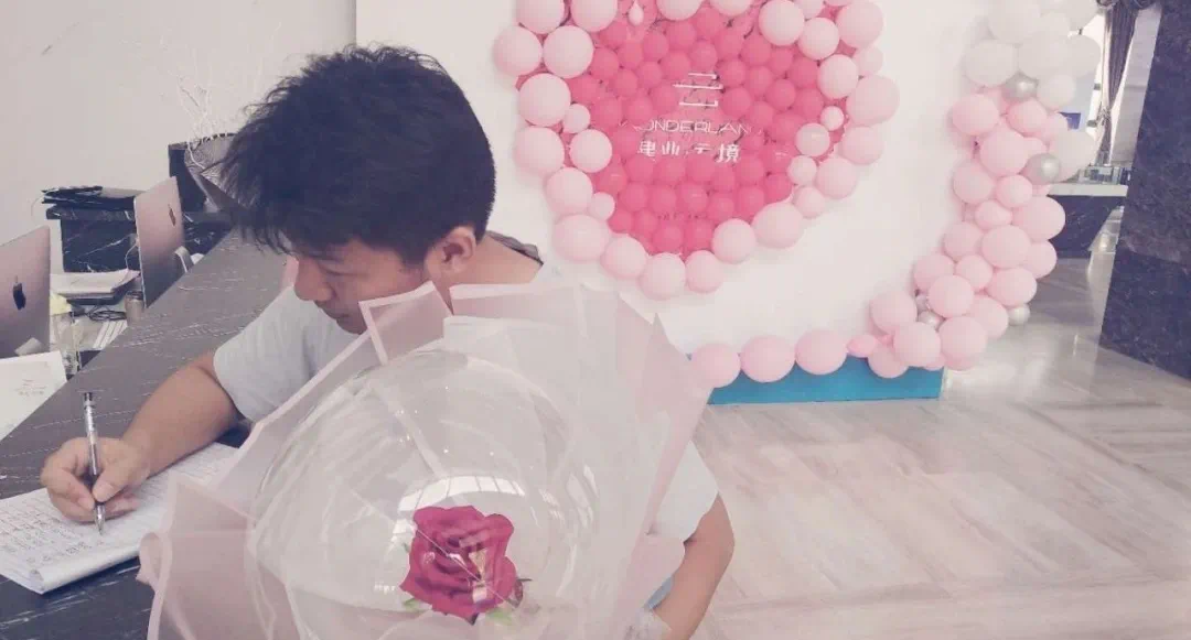 七夕当天,城市展厅布满气球装饰与娇艳玫瑰