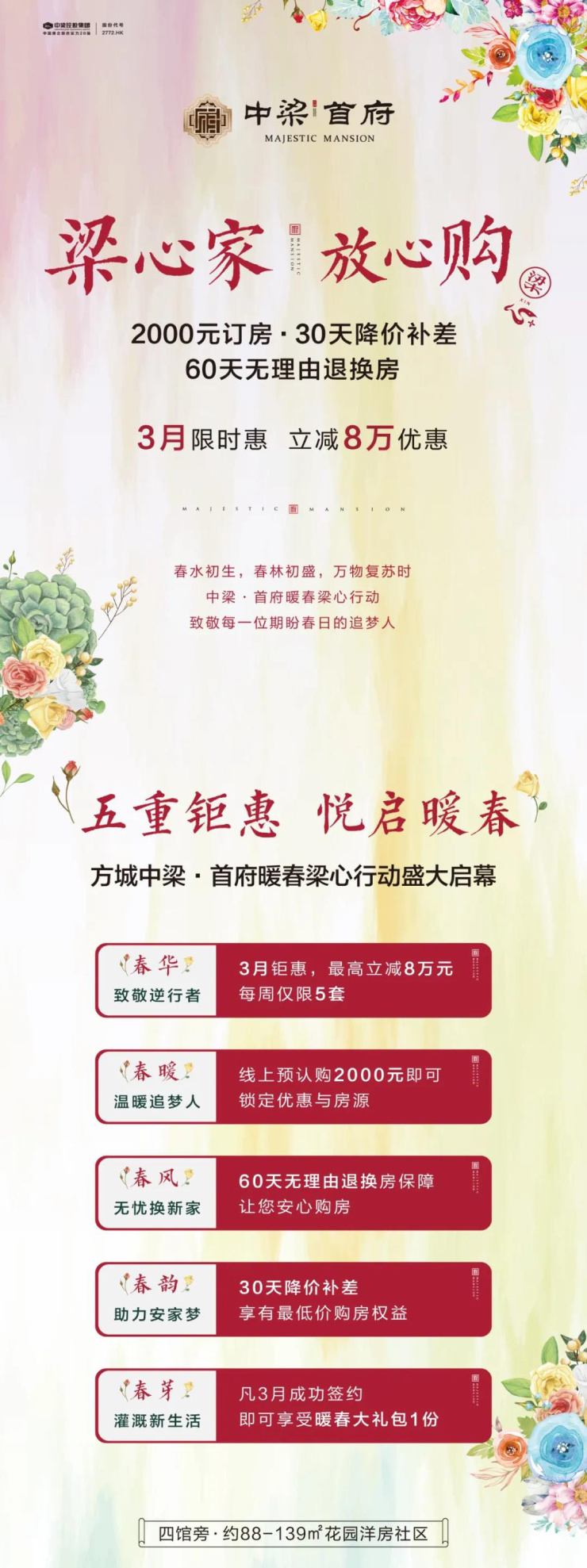 ❀为感谢大家一直以来对中梁·首府的支持与信任,中梁·首府推出“暖春梁心行动”,3月暖春季,较高立减8万元,限时钜惠,机会难得,全城争藏中。活动期间,到访营销中心就有机会获得防疫大礼包1份。中梁·首府用暖心关怀与行动,换您安心无忧;用限时特惠与梁心承诺,助您轻松置业。