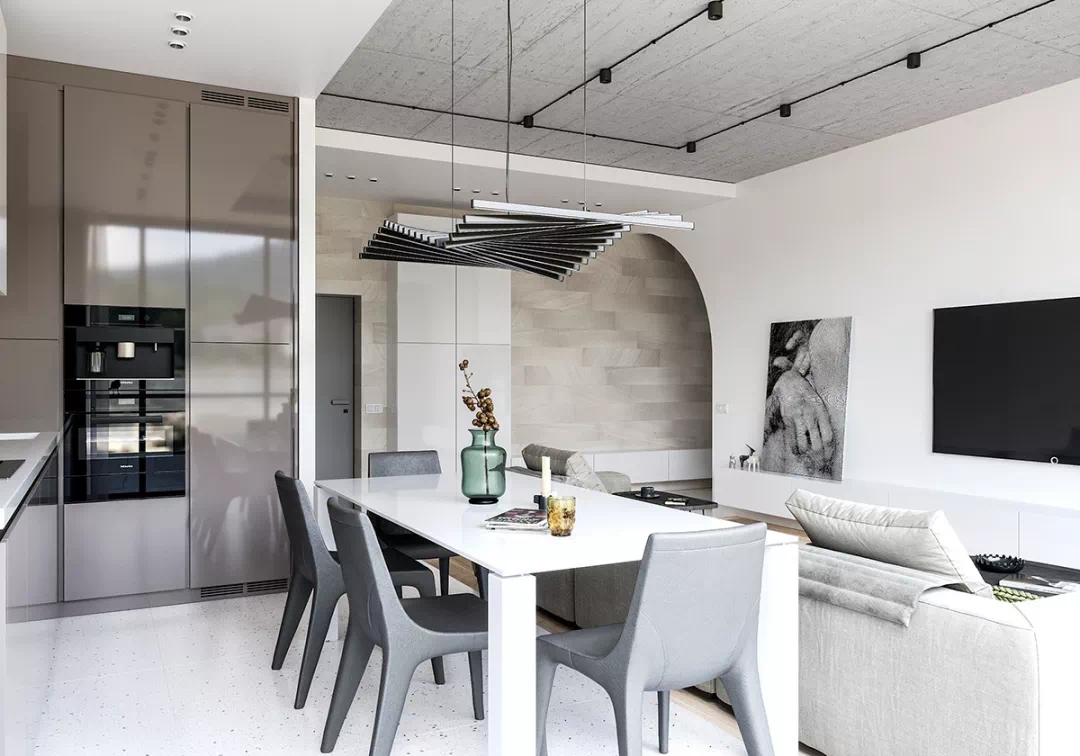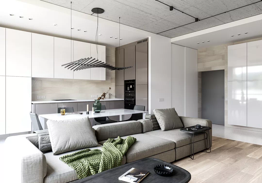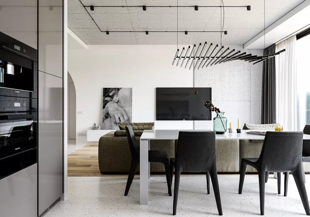 厨房和餐桌就设计在客厅沙发背后